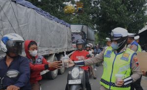 Slawi – Satuan Lalu Lintas Polres Tegal yang dipimpin Kasat Lantas AKP Bharatungga Dharuning Pawuri, S.T.K., S.I.K., M.H., melaksanakan kegiatan pembagian takjil kepada pengguna jalan di kawasan perempatan Patung Obor ruas Jalan Slawi–Jatibarang, Kabupaten Tegal, Rabu (25/2/2026). Kegiatan ini merupakan bentuk kepedulian serta upaya mempererat hubungan Polri dengan masyarakat dalam rangka menyambut bulan suci Ramadan.