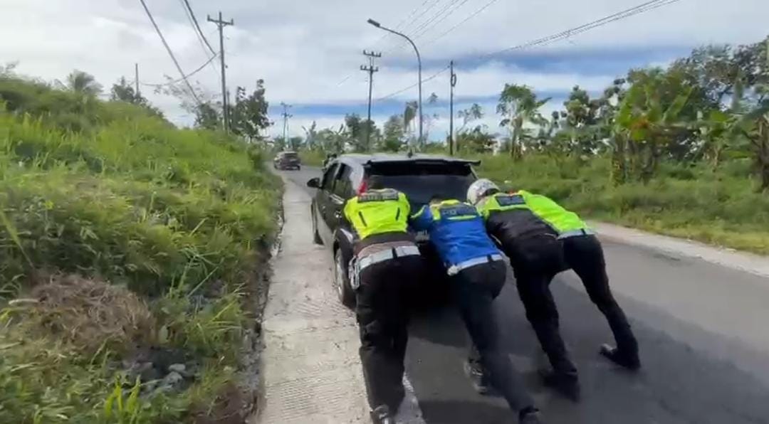 Petugas yang berada di lokasi langsung turun tangan membantu mendorong kendaraan yang mengalami hambatan tersebut, sekaligus mengatur arus lalu lintas agar tidak terjadi penumpukan kendaraan yang lebih panjang.