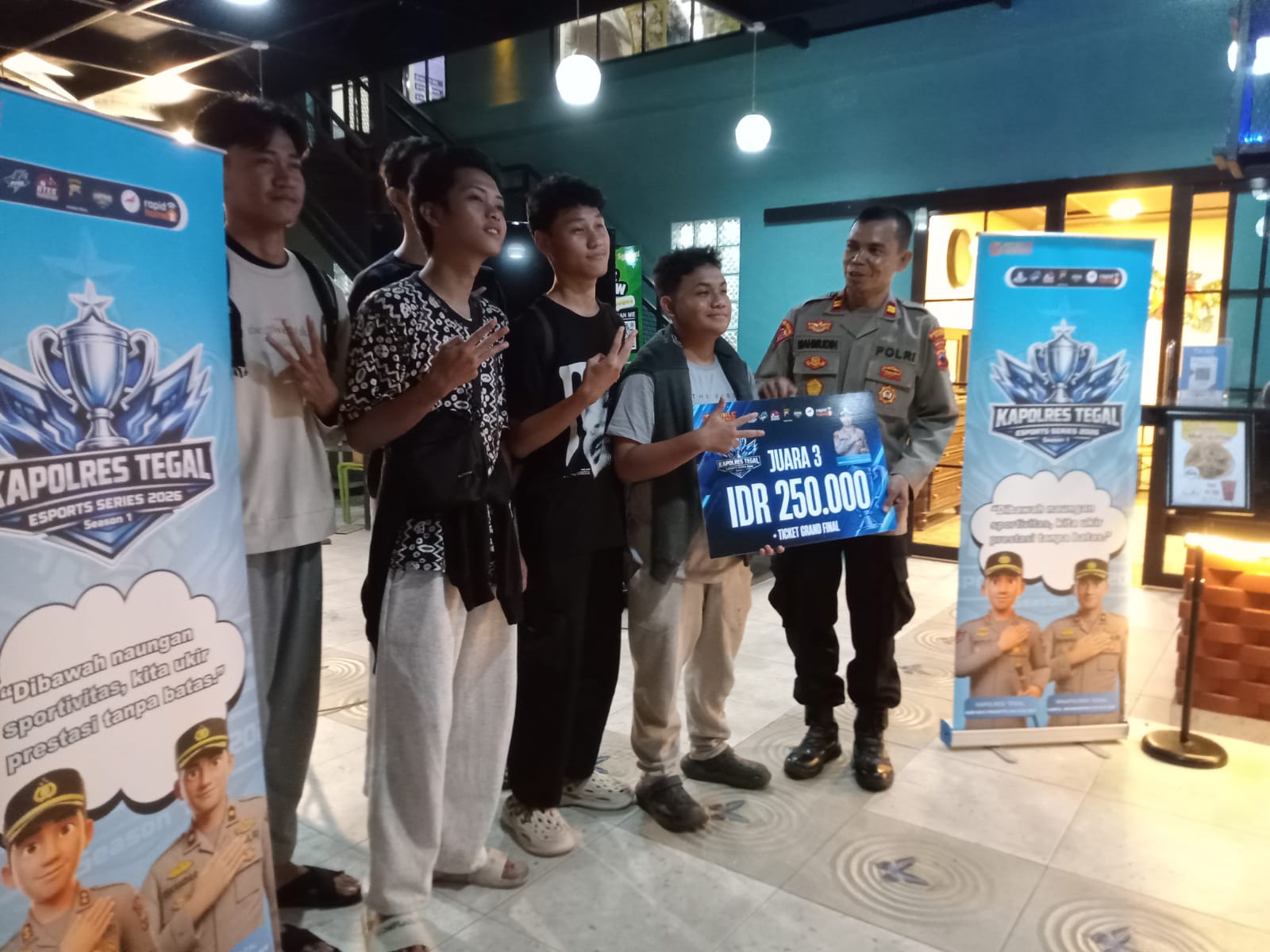 Tiga tim terbaik tersebut selanjutnya akan mewakili Kecamatan Pangkah untuk berlaga pada babak Grand Final Kapolres Tegal Esports Series 2026 yang akan dilaksanakan di Polres Tegal pada 1 Mei 2026.